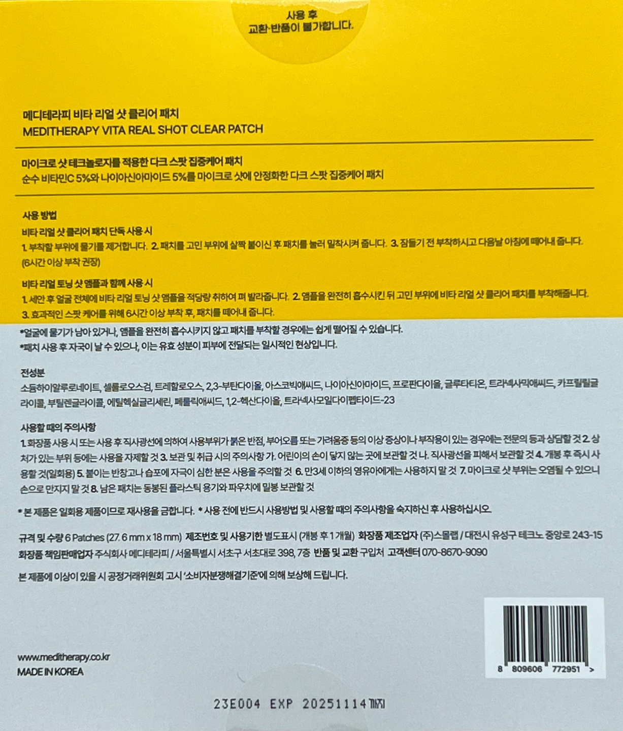 메디테라피 비타 리얼 샷 클리어 패치는 한 상자에 6개의 패치가 들어있다