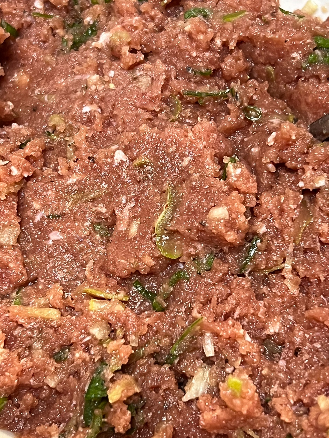다진 고기에 파, 마늘, 후추, 소금, 굴소스를 넣고 따뜻한 물을 조금씩 부어가며 섞어 주었다