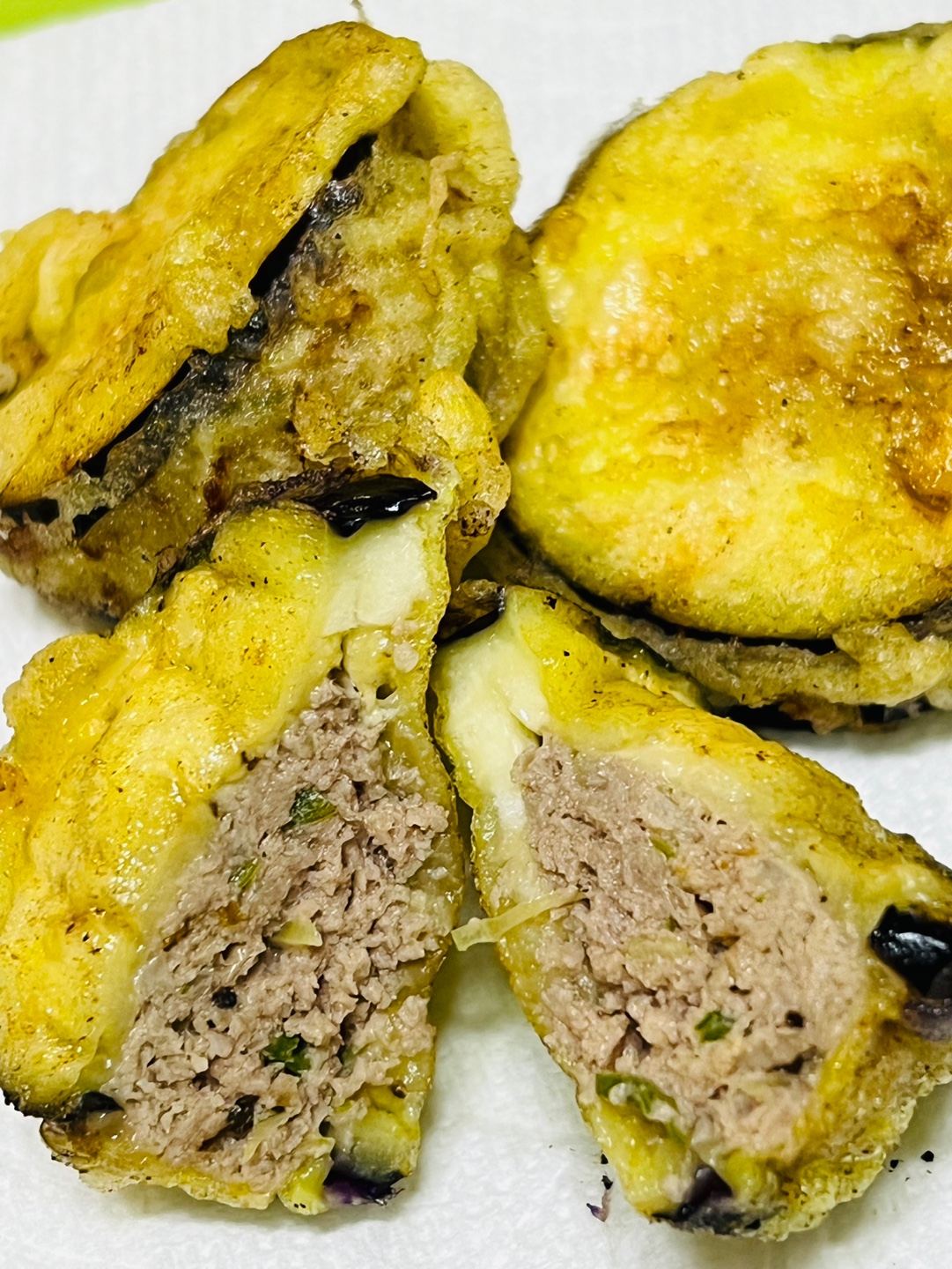 재료: 가지, 다진 고기, 파, 마늘, 소금, 후추, 굴소스, 튀김가루, 전분가루