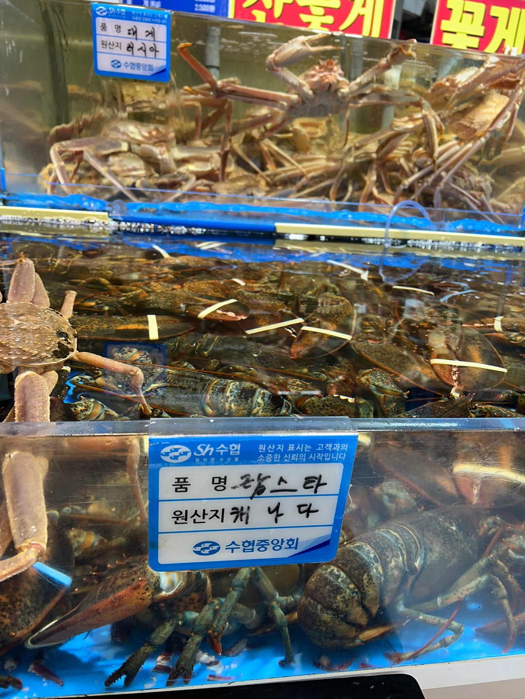 모든 종류의 갑각류들이 깔끔한 수조에서 싱싱하게 관리되고 있었다