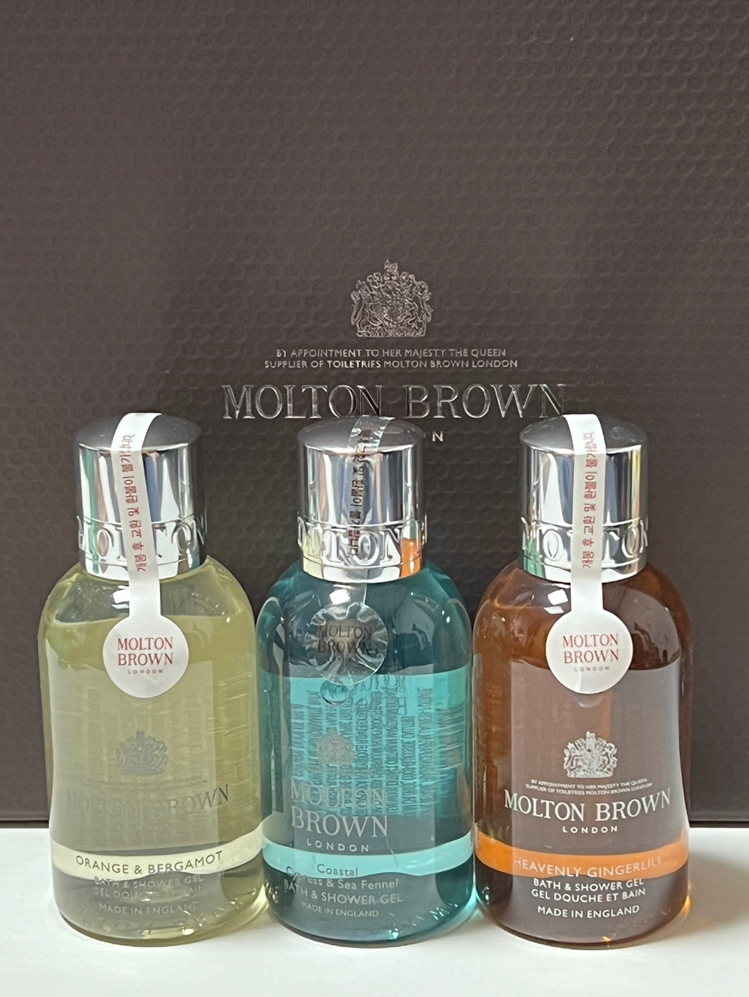 몰튼 브라운 향수와 몰튼 브라운 배쓰 & 샤워젤들이 들어 있다