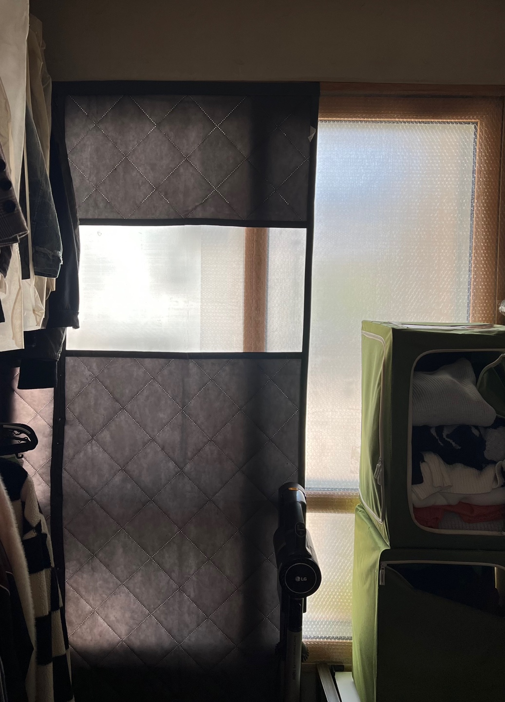 고정문에는 뽁뽁이를 붙여 문을 봉해 버리고 베란다로 나가는 쪽 문에 따솜 막풍이를 설치했다