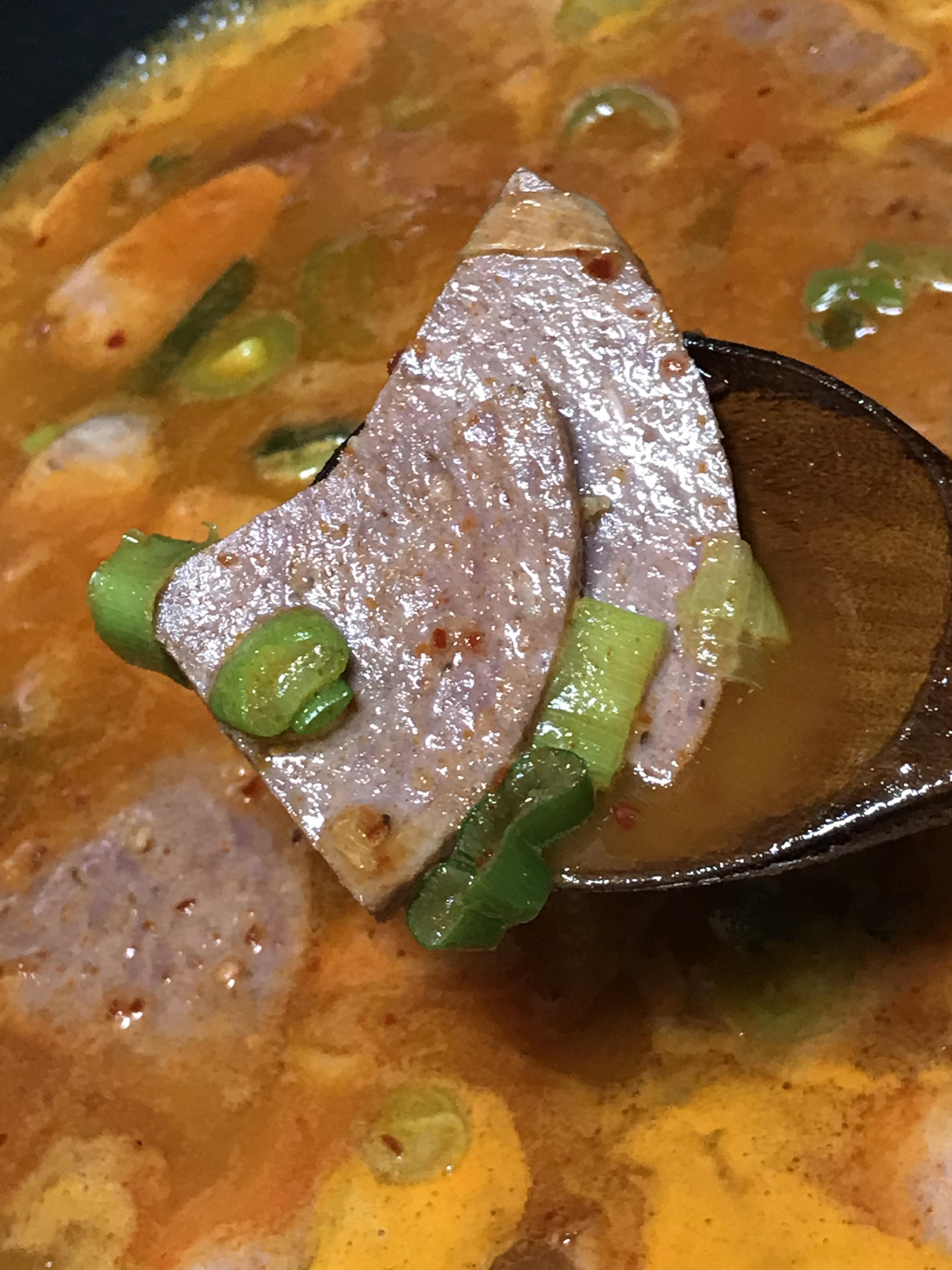쟌슨빌 부대찌개 본연의 맛을 느껴보려고 신라면 건면만 넣고 아무것도 넣지 않고 끓여봤다 쟌슨빌 부대찌개 국물 맛은 정말 진하고 매콤하며 간이 살짝 센 편이다 싱겁게 먹는 사람은 짜다 싶은 정도 매운 맛은 역간 칼칼한정도 쟌슨빌 부대찌개 속에 들어 있는 햄과 소시지는 맛이 진짜 진했다 햄과 소시지 속에 치즈가 들어 있는 듯한 진한 맛이났다 신라면 건면을 삶은 후에 넣고 살짝 더 끓였는데도 정말 진한 국물 맛을 느낄 수 있었다