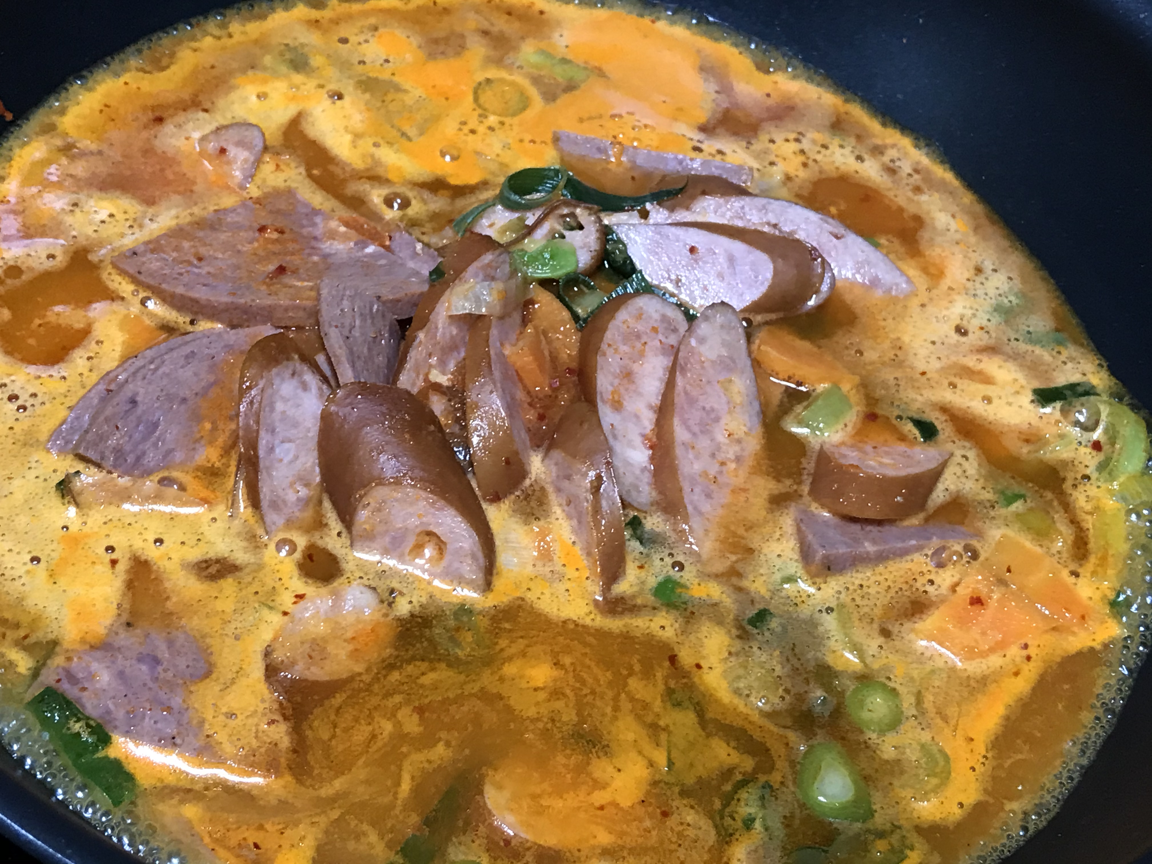 젼슨빌 부대찌개를 해동한 후 냄비에 부었더니 이름 그대로 푸짐한 부대찌개 였다 햄과 소시지 가 정말 푸짐하게 들어 있다