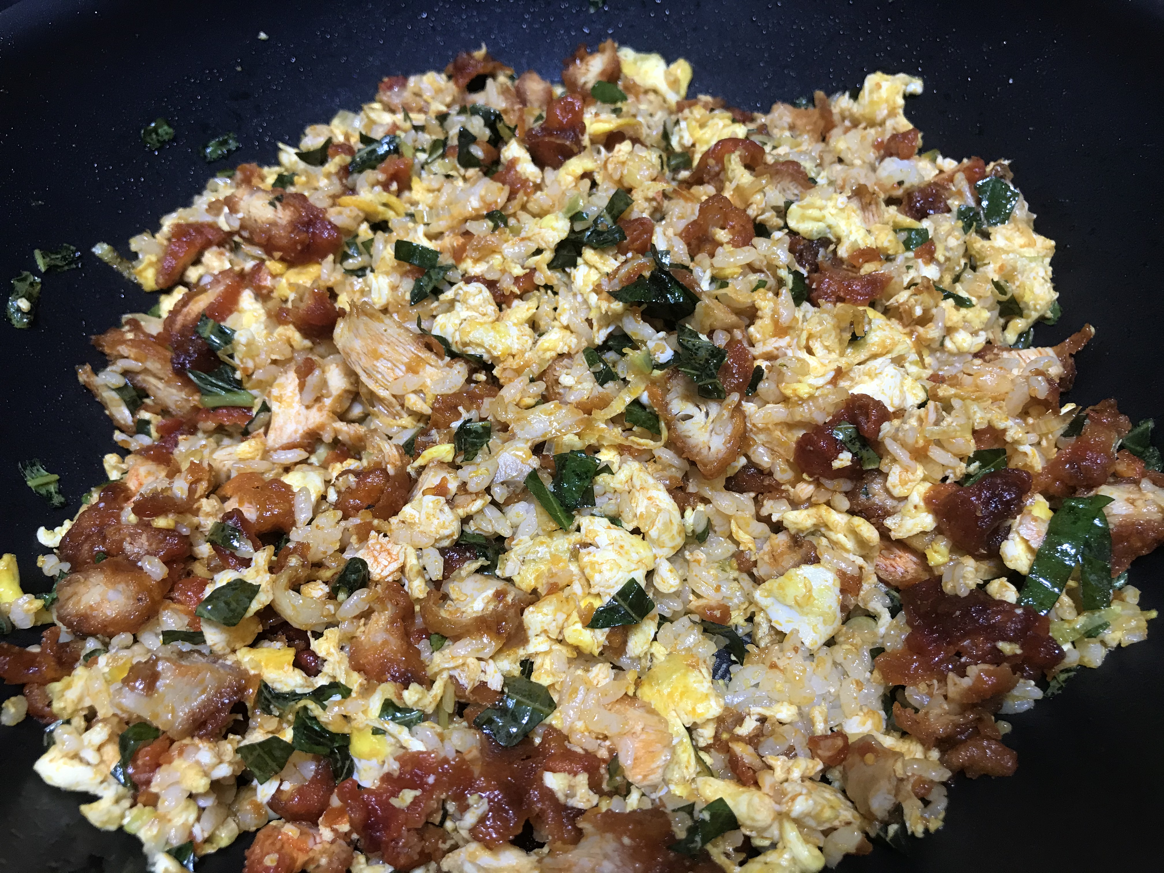 맥시카나 불닭치킨 볶음밥 재료 불닭치킨 5-6 조각(더 넣으면 화장실 괴롭다함) 달걀 4개 대파 한뿌리 소금 밥 한공기 (햇반 1개) 깻잎 3-4장 없으면 김 가루