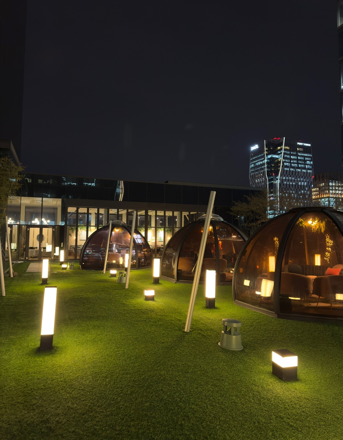 아름다운 조명과 반짝이는 성탄 장식들로 장식된 루프탑과 비글루