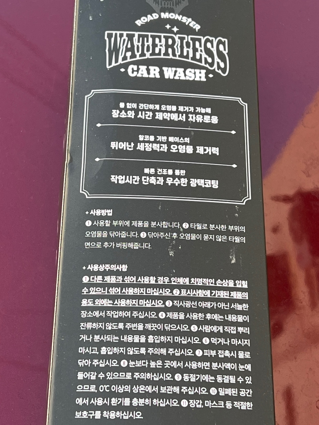 물 없이 세차하는 로드몬스터 워터리스를 뿌리고 타월로 슬슬 문지르기만 하면 마법처럼 깨끗해졌다