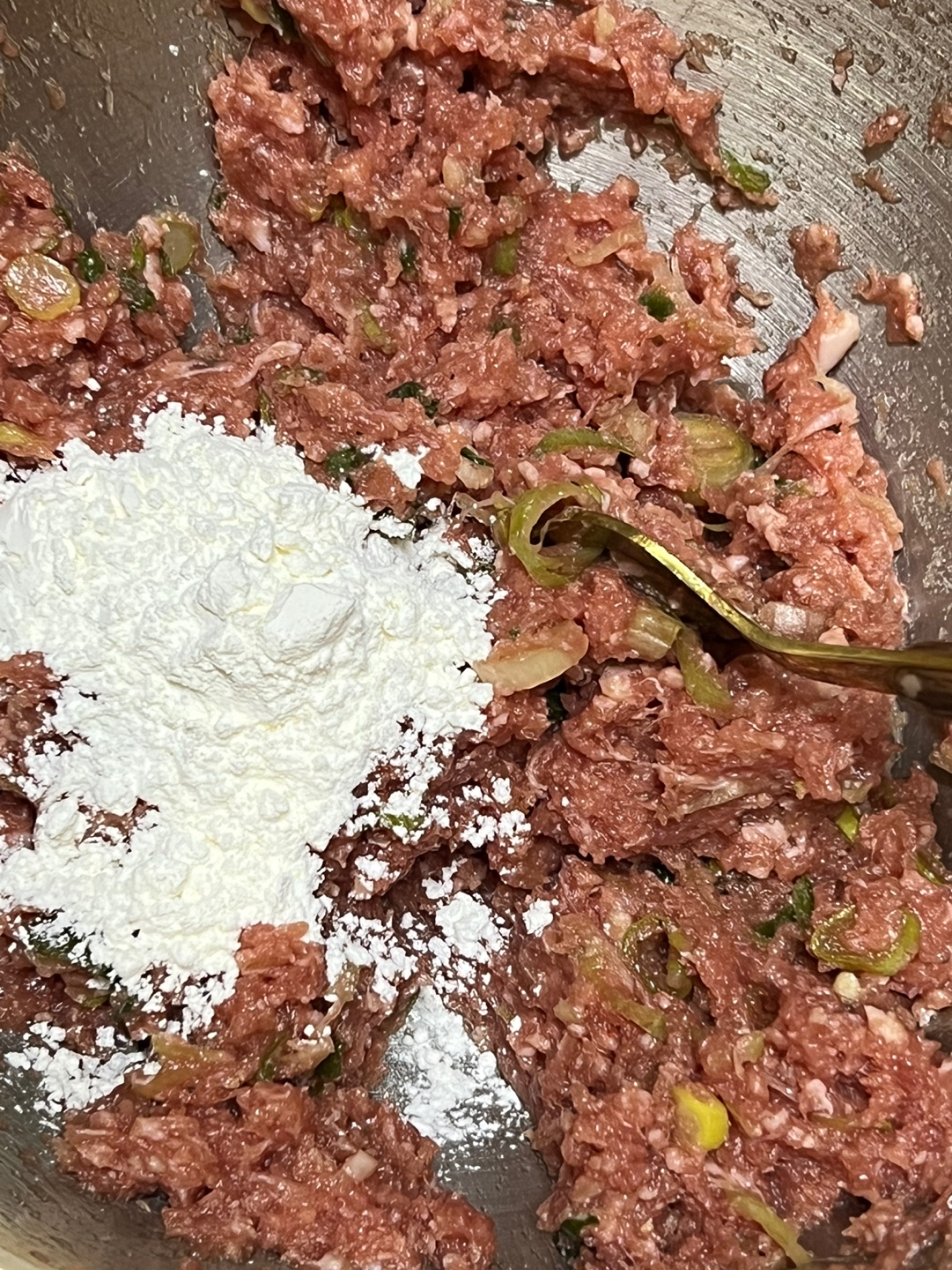 다진 고기에 파, 마늘, 후추, 소금, 굴소스를 넣고 따뜻한 물을 조금씩 부어가며 섞어 주었다