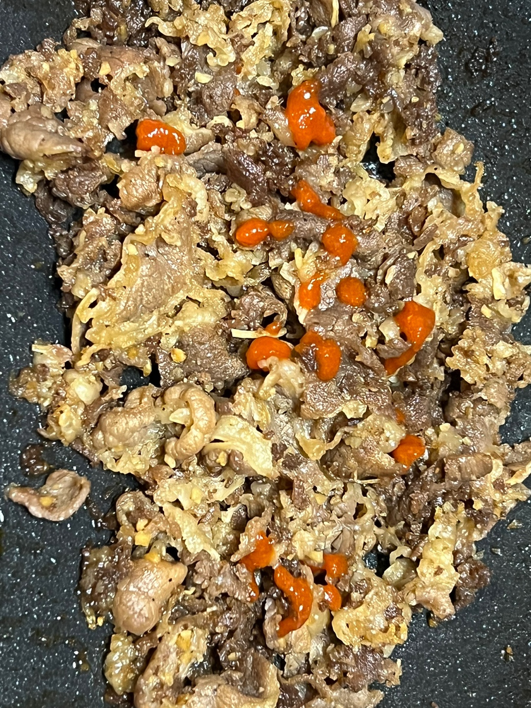 기름기를 제거한 고기에 스리라차 소스를 조금 넣어주면