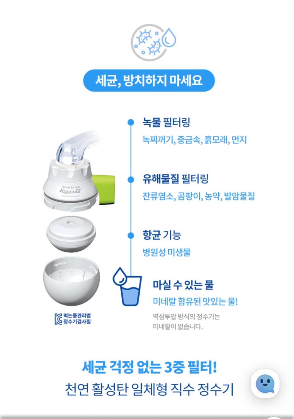 인증도 되어 있고 작은 정수기지만 3단계로 철저하게 정화되는 시스템이라 믿고 사용하고 있다