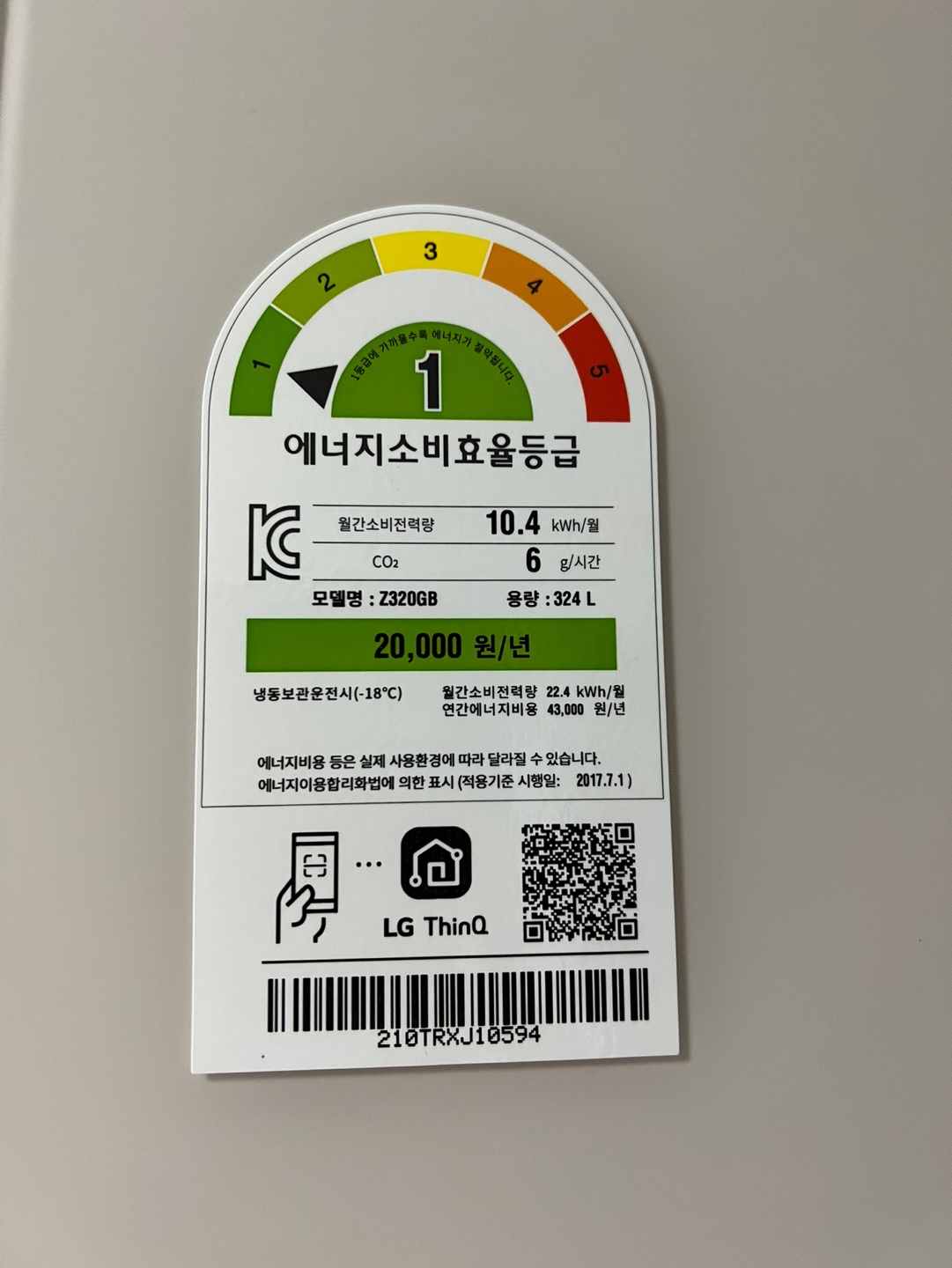 LG김치냉장고 Z320GB는 에너지소비효율 1등급 제품으로 년간 전기료가 20,000원으로 절전형이라 더 좋았다
