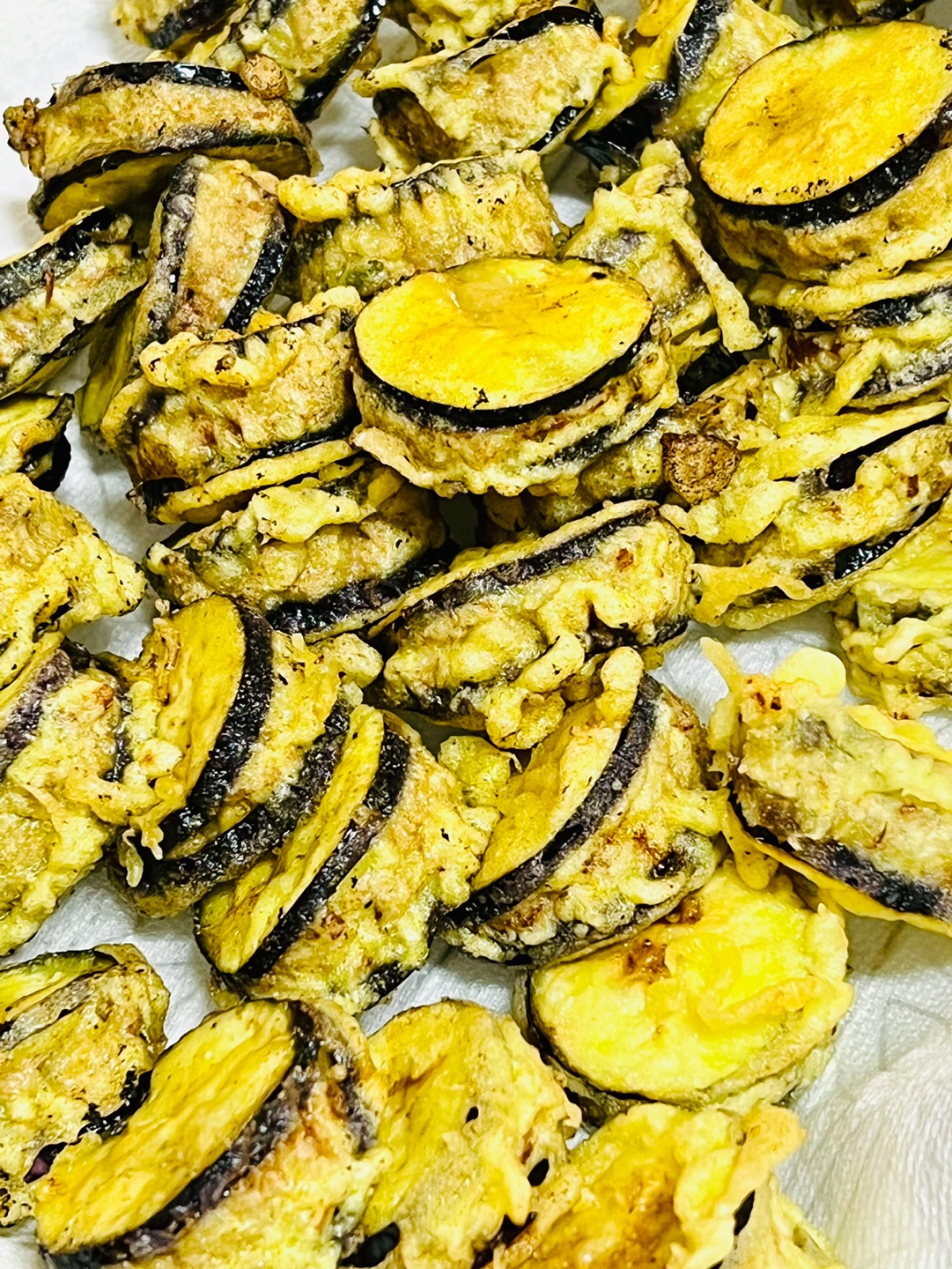 튀김가루에 강황가루를 섞어 묽게 만든 반죽을 준비해 가지만두 튀김옷을 입혀줬다