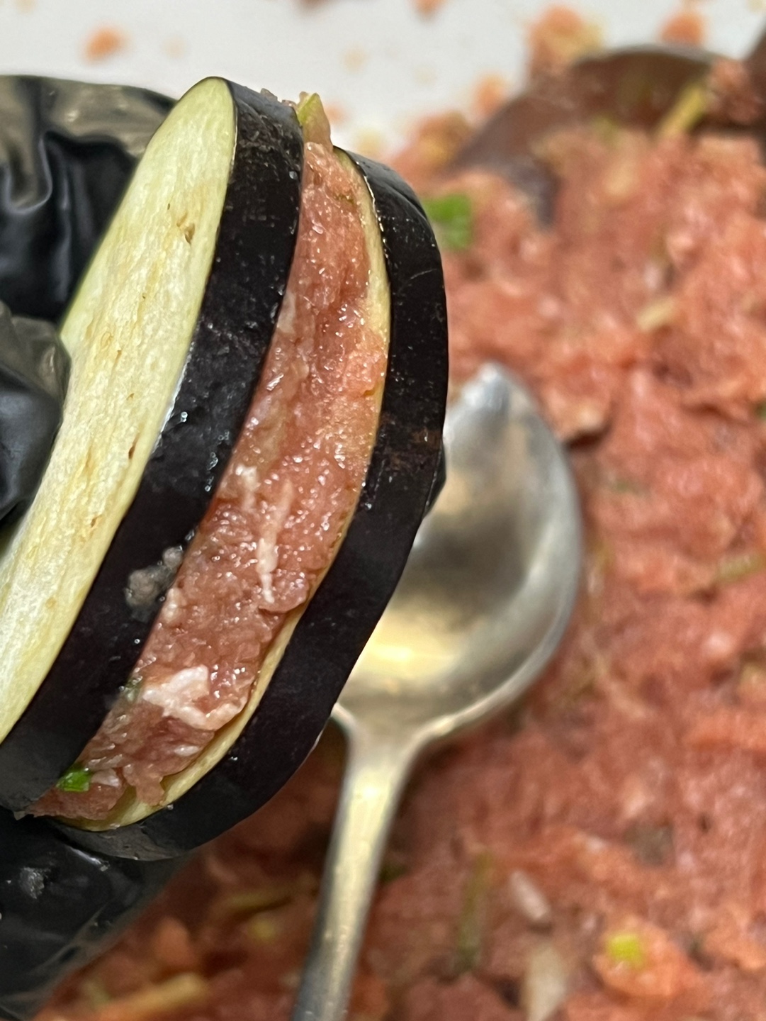 재료: 가지, 다진 고기, 파, 마늘, 소금, 후추, 굴소스, 튀김가루, 전분가루
