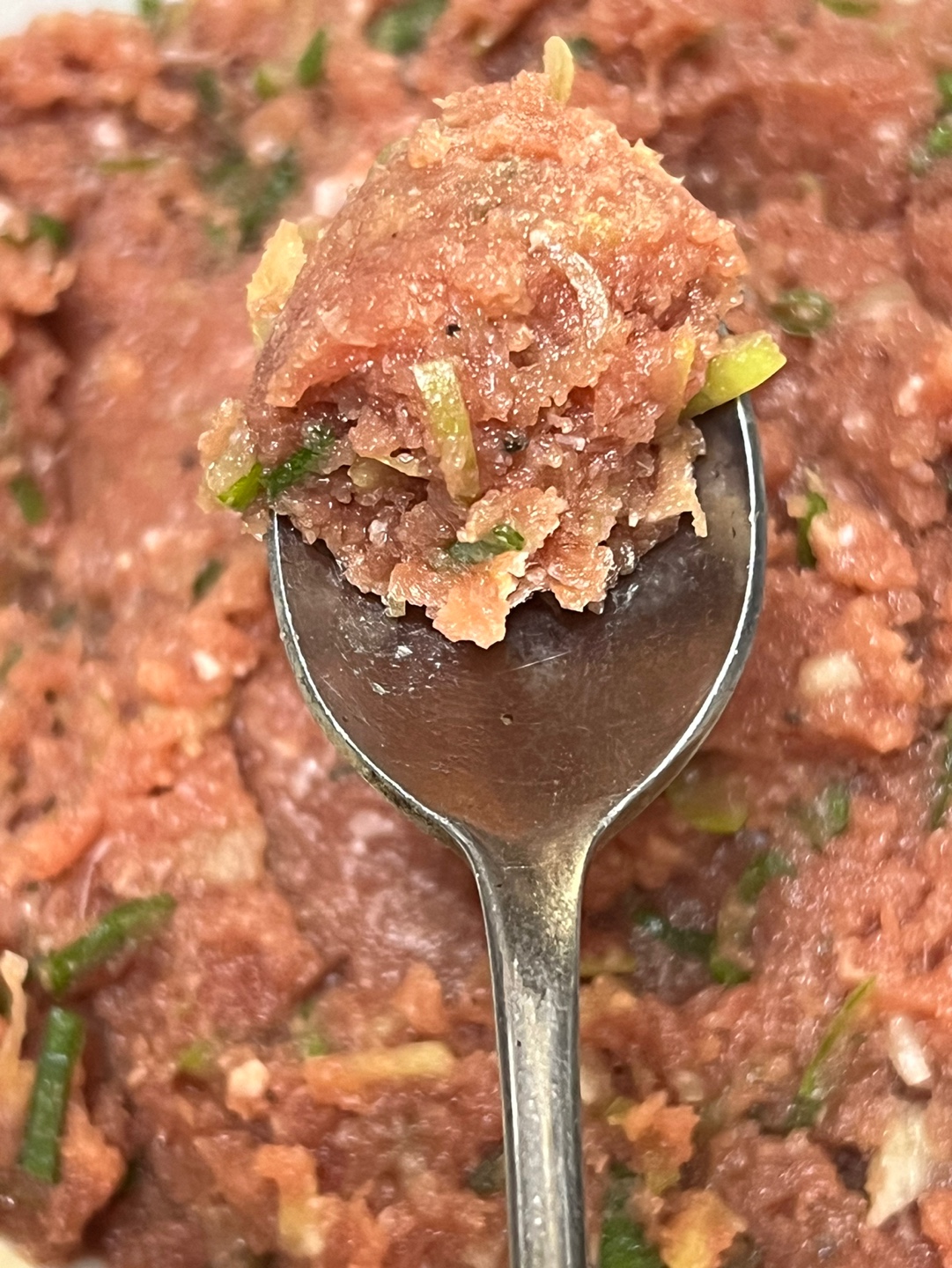 다진 고기에 파, 마늘, 후추, 소금, 굴소스를 넣고 따뜻한 물을 조금씩 부어가며 섞어 주었다